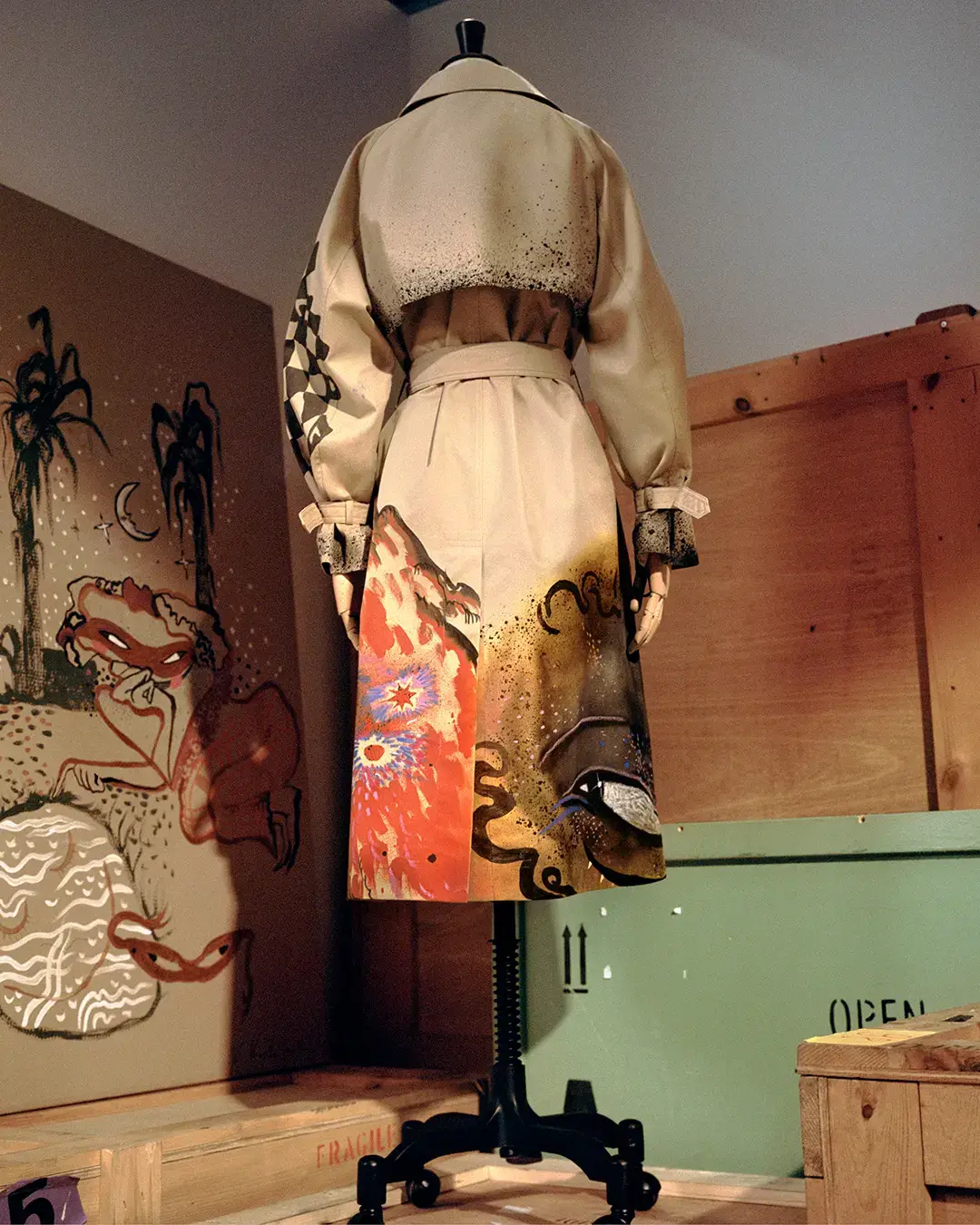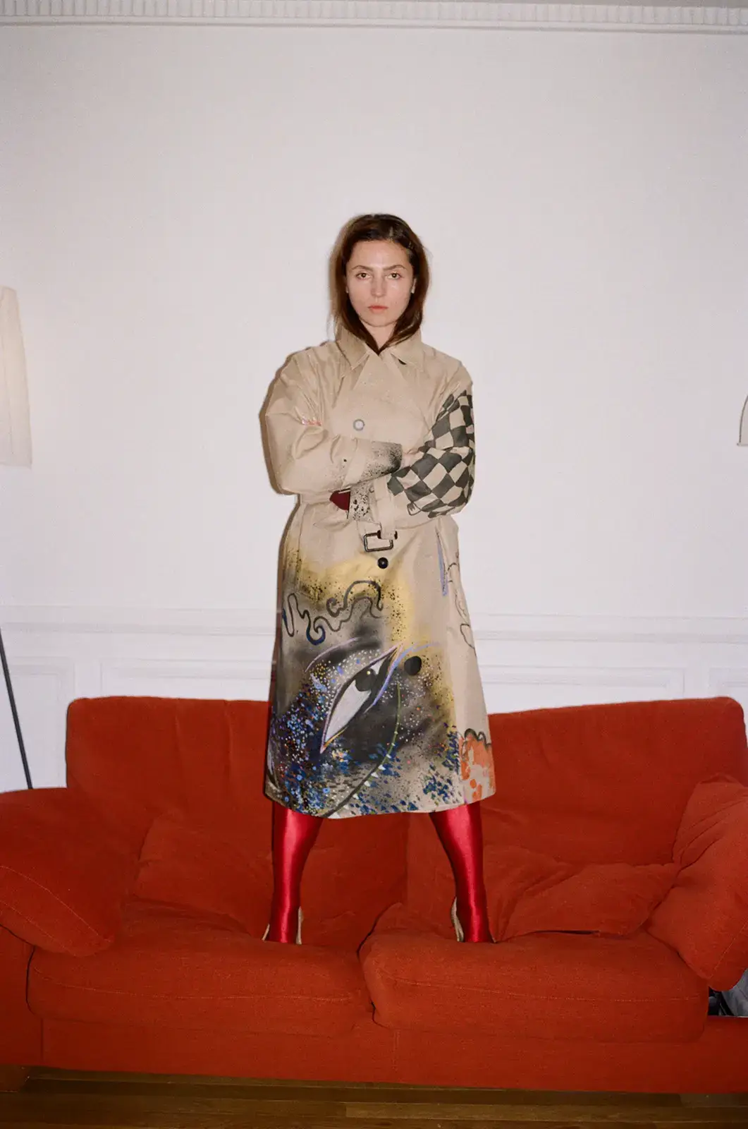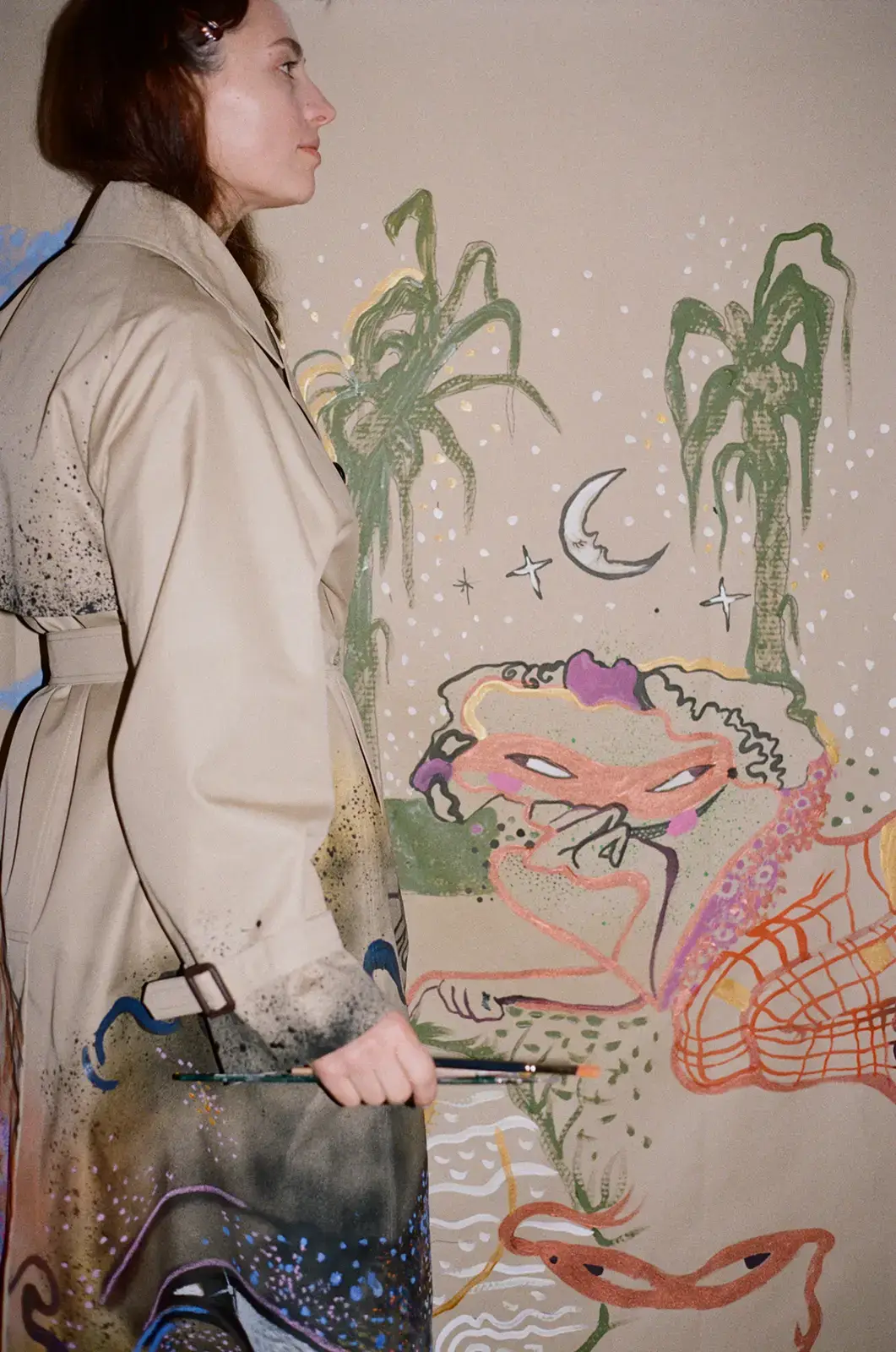The idea for the trench coat grew out of my ongoing reflections on theatricality, the mask, and the figure of the trickster — a recurring character in my work. The trickster is a figure of transition, play, and transformation. He crosses boundaries, poses questions, but never offers clear answers. On the coat, he appears as a timeless presence — maybe observing, maybe performing, maybe already disappearing. I’m always drawn to the space between dreaming and waking, between the self and the image. To me, a trench coat is not just a garment — it’s almost like a curtain or a stage costume. It allows someone to enter a character, to try on a role, to become someone else — or to discover something more truthful through that act of play. It’s a kind of portable space where imagination takes form. Visually, I used the motif of the mask — as a symbol of duality and hidden perception — and the checkered floor, which speaks to games, strategy, contrast, tension. These elements are connected through my continuous painting technique — the line flows freely, as if alive, creating a sense of motion, illusion, a fleeting stage.