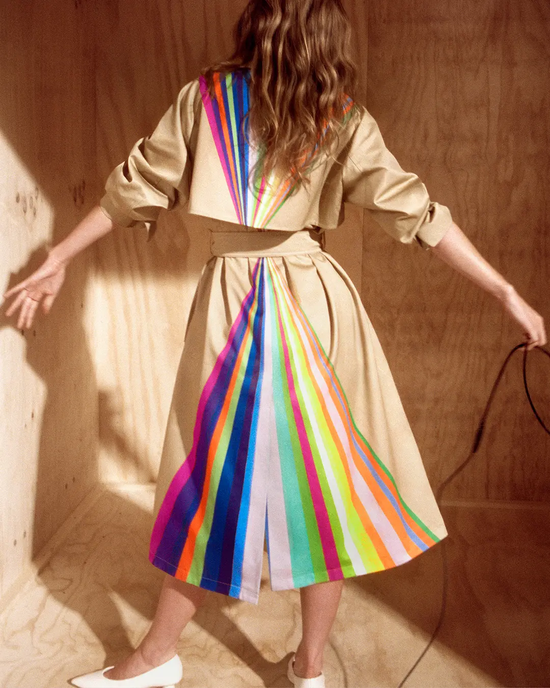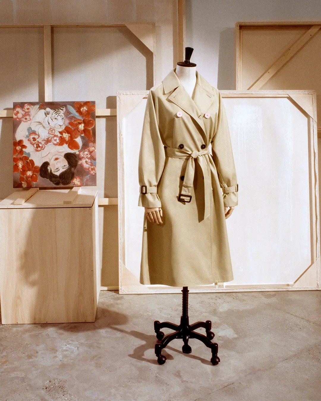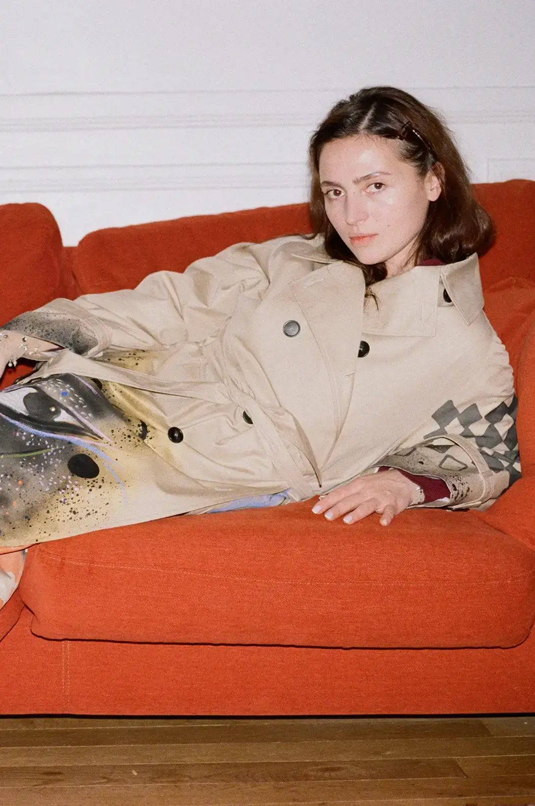 The idea for the trench coat grew out of my ongoing reflections on theatricality, the mask, and the figure of the trickster — a recurring character in my work. The trickster is a figure of transition, play, and transformation. He crosses boundaries, poses questions, but never offers clear answers. On the coat, he appears as a timeless presence — maybe observing, maybe performing, maybe already disappearing. I’m always drawn to the space between dreaming and waking, between the self and the image. To me, a trench coat is not just a garment — it’s almost like a curtain or a stage costume. It allows someone to enter a character, to try on a role, to become someone else — or to discover something more truthful through that act of play. It’s a kind of portable space where imagination takes form. Visually, I used the motif of the mask — as a symbol of duality and hidden perception — and the checkered floor, which speaks to games, strategy, contrast, tension. These elements are connected through my continuous painting technique — the line flows freely, as if alive, creating a sense of motion, illusion, a fleeting stage.