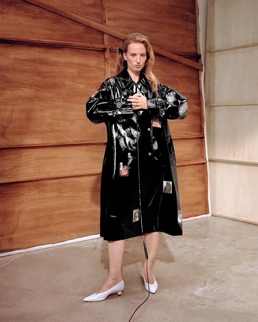 I wanted to work with the trench as a sartorial symbol of both exhibitionism and clandestinity. I wanted to further fetishize this iconic garment by making it in black patent and using these little cutout images of pussy pin ups to accentuate the kind of atmospheres that this garment conjures for me. I was influenced by punk fashion that used a lot of fetish and BDSM clothing that was customised with images taken from erotic magazines and pulp fiction book covers as well as pin up photographers Bunny Yager and Paula Klaw, pioneering female pinup photographers working in the 1950s. The hand illustrated pictures are a cute wink to various traditions of erotic photography and ephemera.