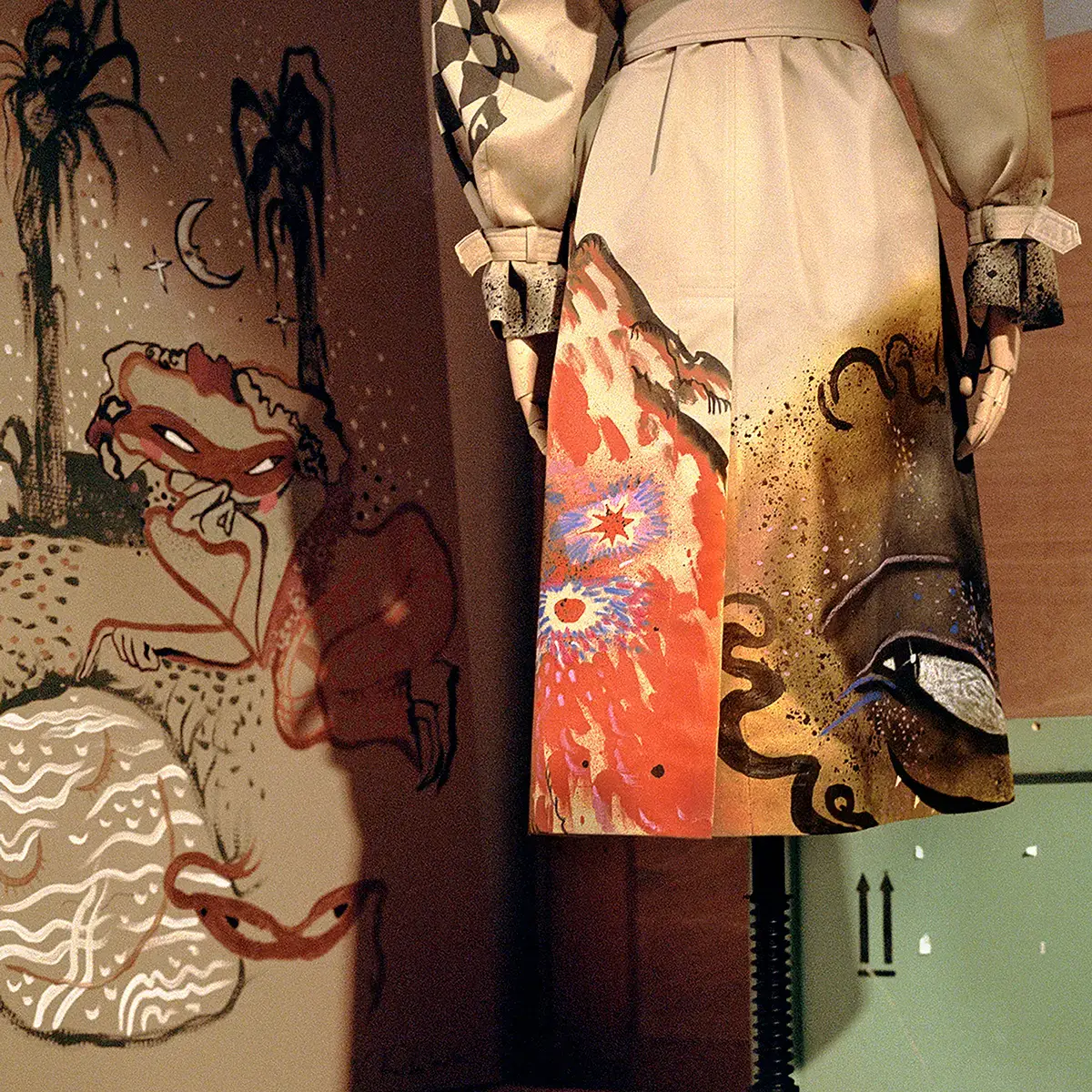 I wanted to work with the trench as a sartorial symbol of both exhibitionism and clandestinity. I wanted to further fetishize this iconic garment by making it in black patent and using these little cutout images of pussy pin ups to accentuate the kind of atmospheres that this garment conjures for me. I was influenced by punk fashion that used a lot of fetish and BDSM clothing that was customised with images taken from erotic magazines and pulp fiction book covers as well as pin up photographers Bunny Yager and Paula Klaw, pioneering female pinup photographers working in the 1950s. The hand illustrated pictures are a cute wink to various traditions of erotic photography and ephemera.